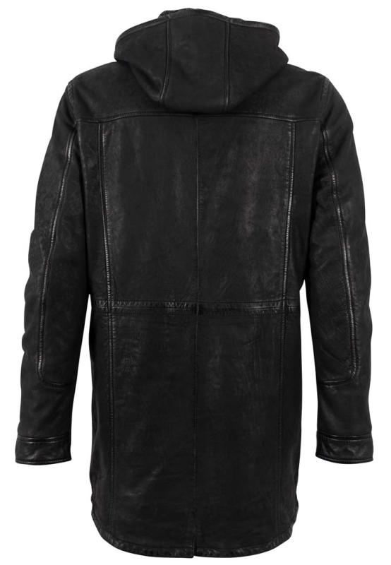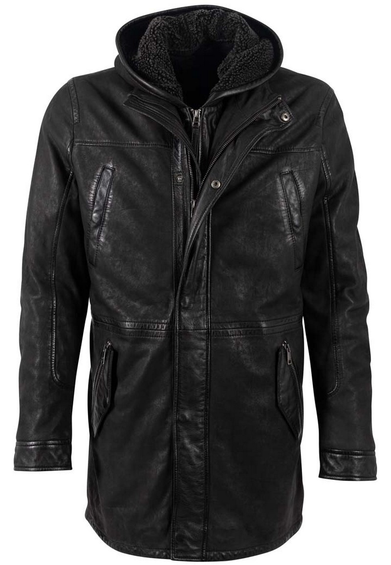 Upea pitkä nahkatakki irroitettavalla huppuosalla.